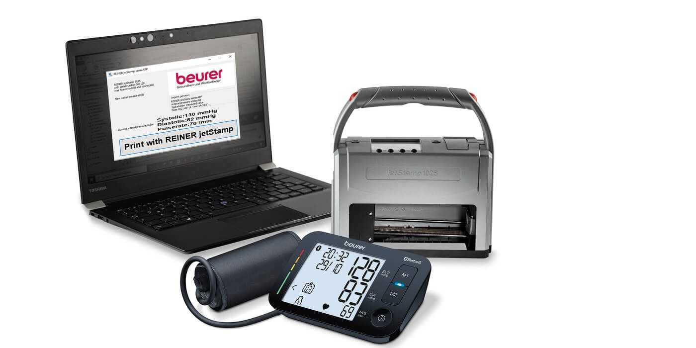 Para una vida sana: Medición de la presión arterial y documentación con el Beurer BM 54, la senseAPP de REINER y la > impresora inkjet móvil jetStamp 1025